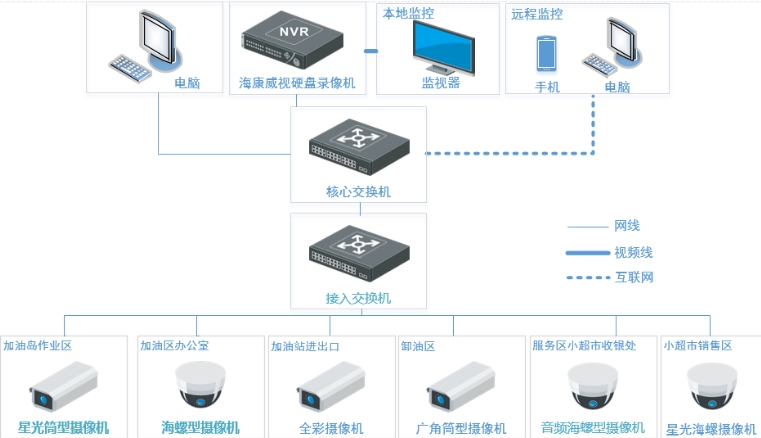 本方案适用于小型加油站的场景。以安全为切入点,针对作业区安全、超市安全、油区存储安全、远程报警、高效存储等需求而设计。监控系统作为辅助系统能够为加油站日常运营监管和时候追溯提供帮助,同时带来全方位高清守护,让管理人员可以随时通过手机或电脑了解加油站的异常情况。